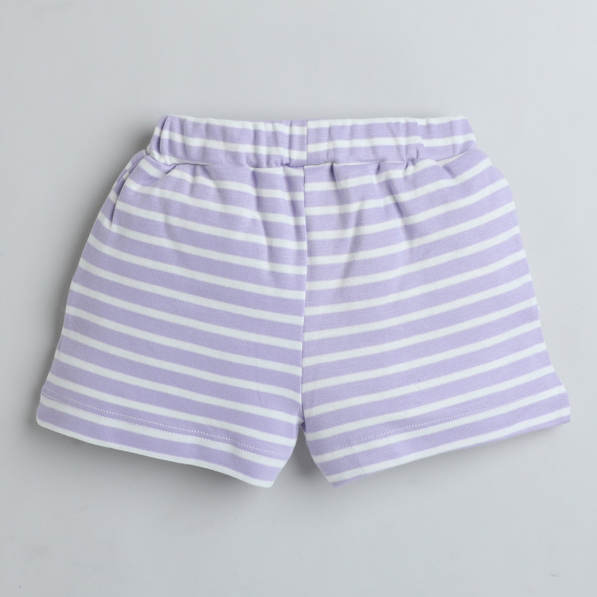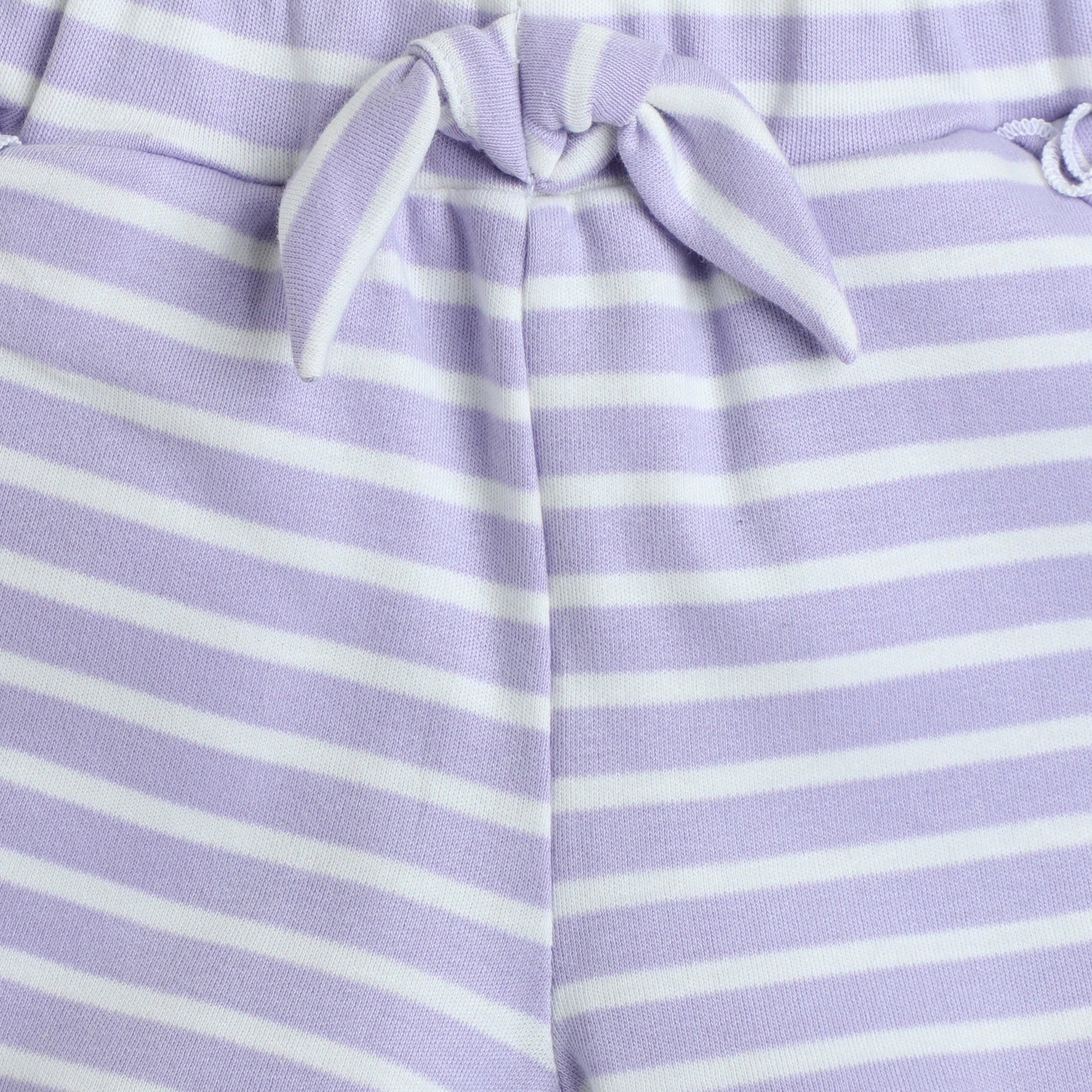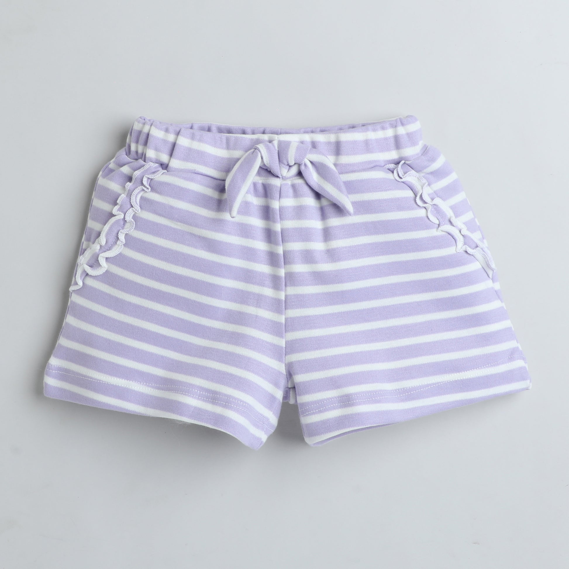 Refresh your little girl’s summer style with these adorable lavender and white striped cotton shorts. Designed with comfort and cuteness in mind, they feature a soft elastic waistband, a charming bow tie at the front, and delicate frill accents on the sides. Crafted from breathable cotton fabric, these shorts are perfect for playtime, outings, and everyday wear. Pair them with t-shirts or tops for an effortlessly stylish look.