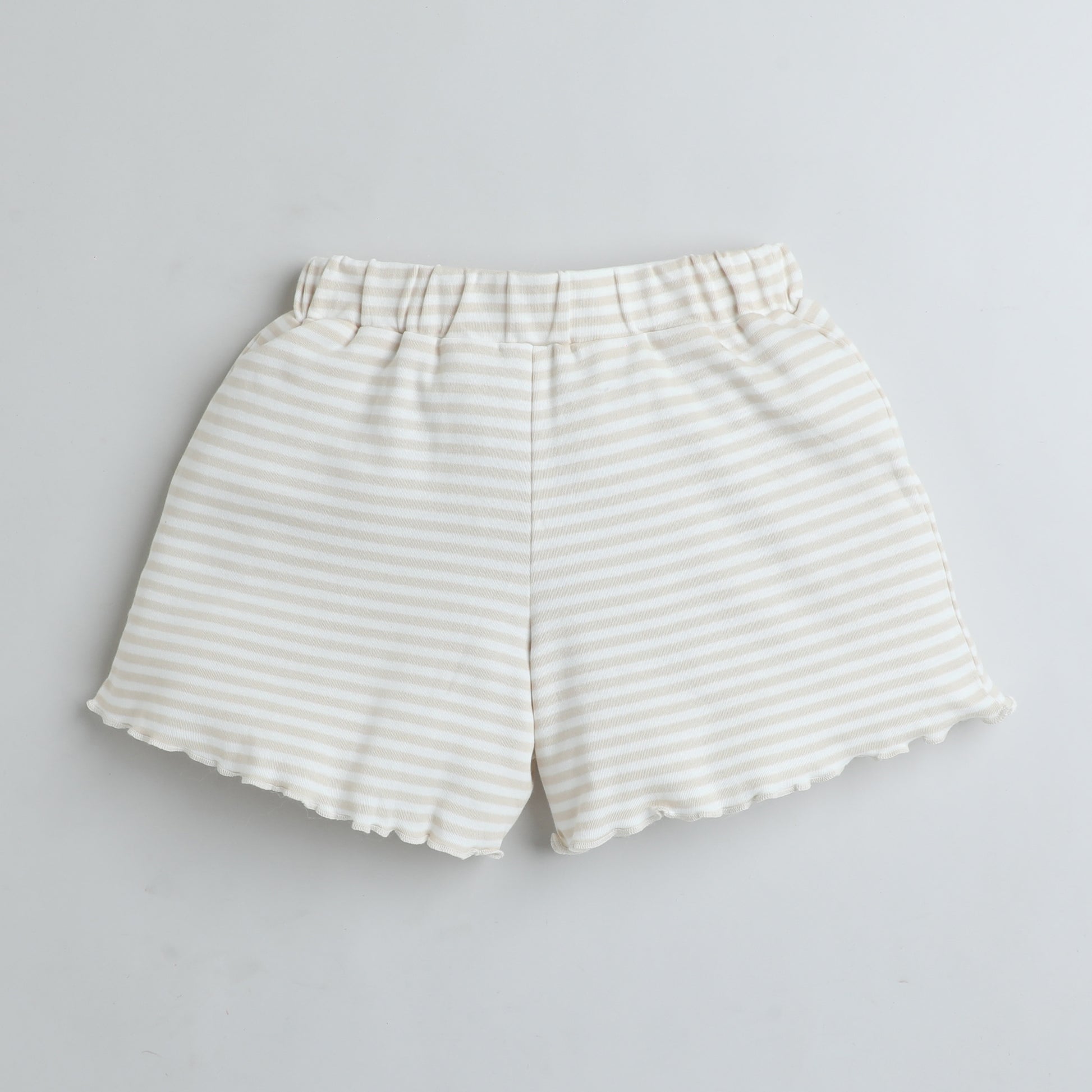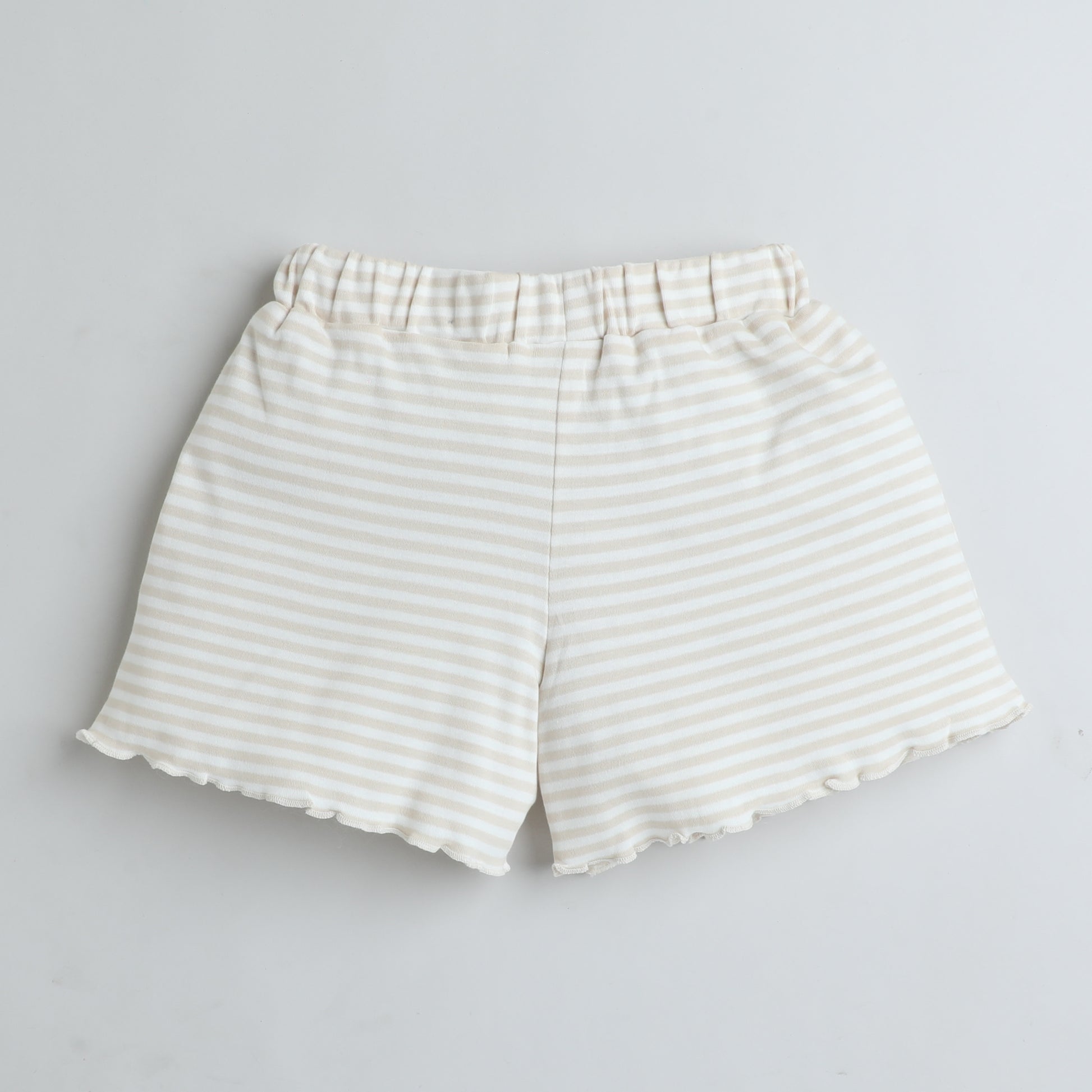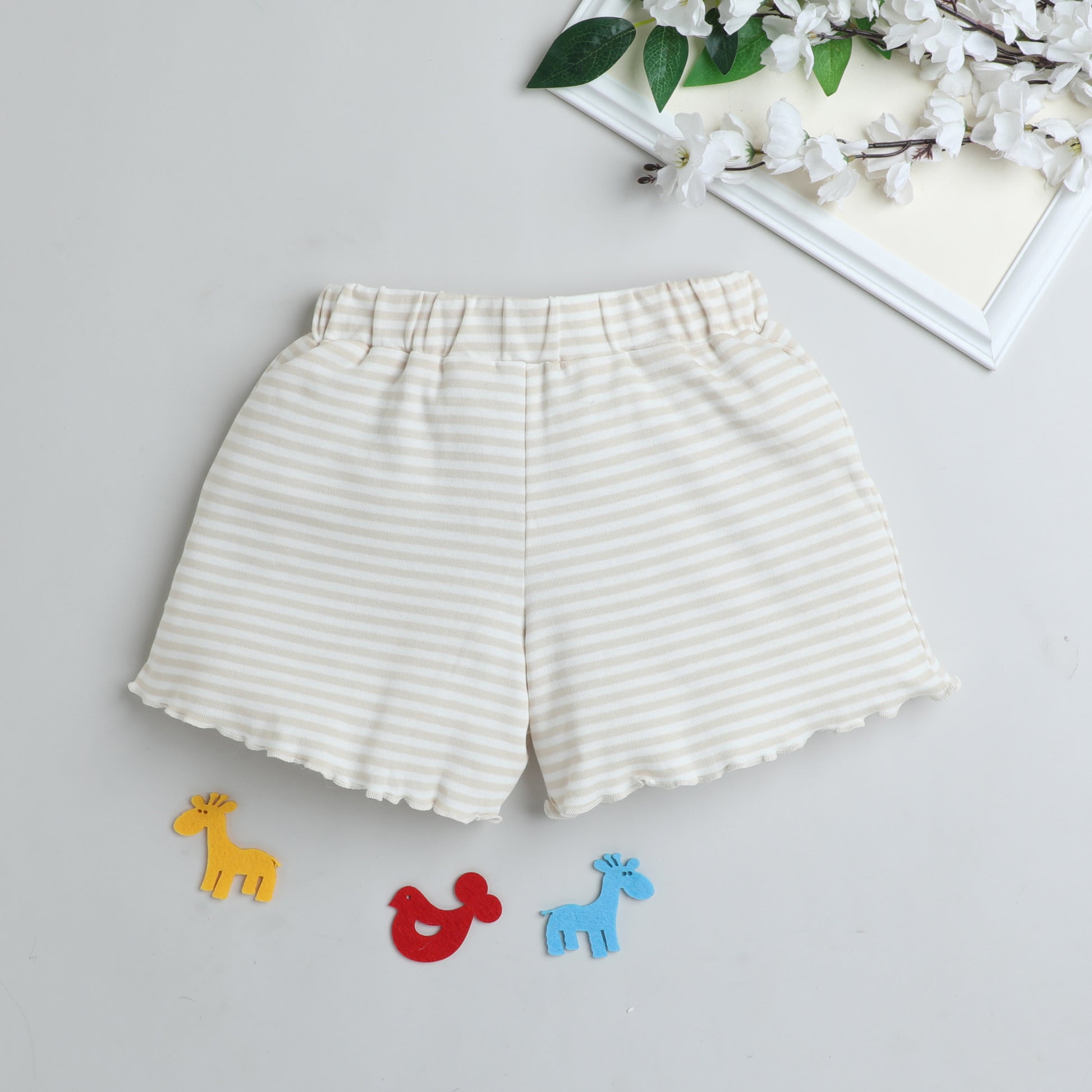 Add a touch of effortless charm to your little girl’s everyday look with these beige and white striped cotton shorts. Crafted from soft, breathable fabric, these shorts ensure all-day comfort while keeping her style on point. The elastic waistband allows for a secure yet flexible fit, while the delicate lettuce hem adds a playful finish. Perfect for casual outings, playdates, or summer wear, these shorts are both versatile and trendy.