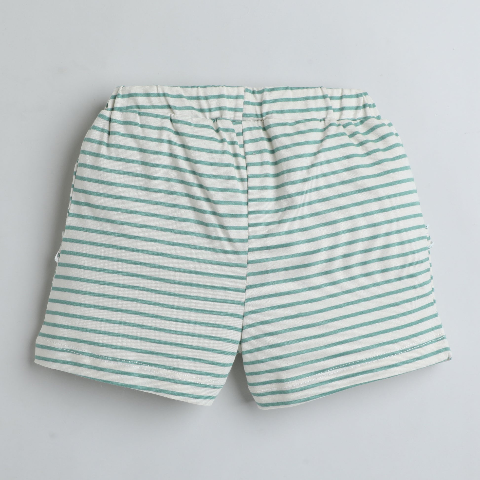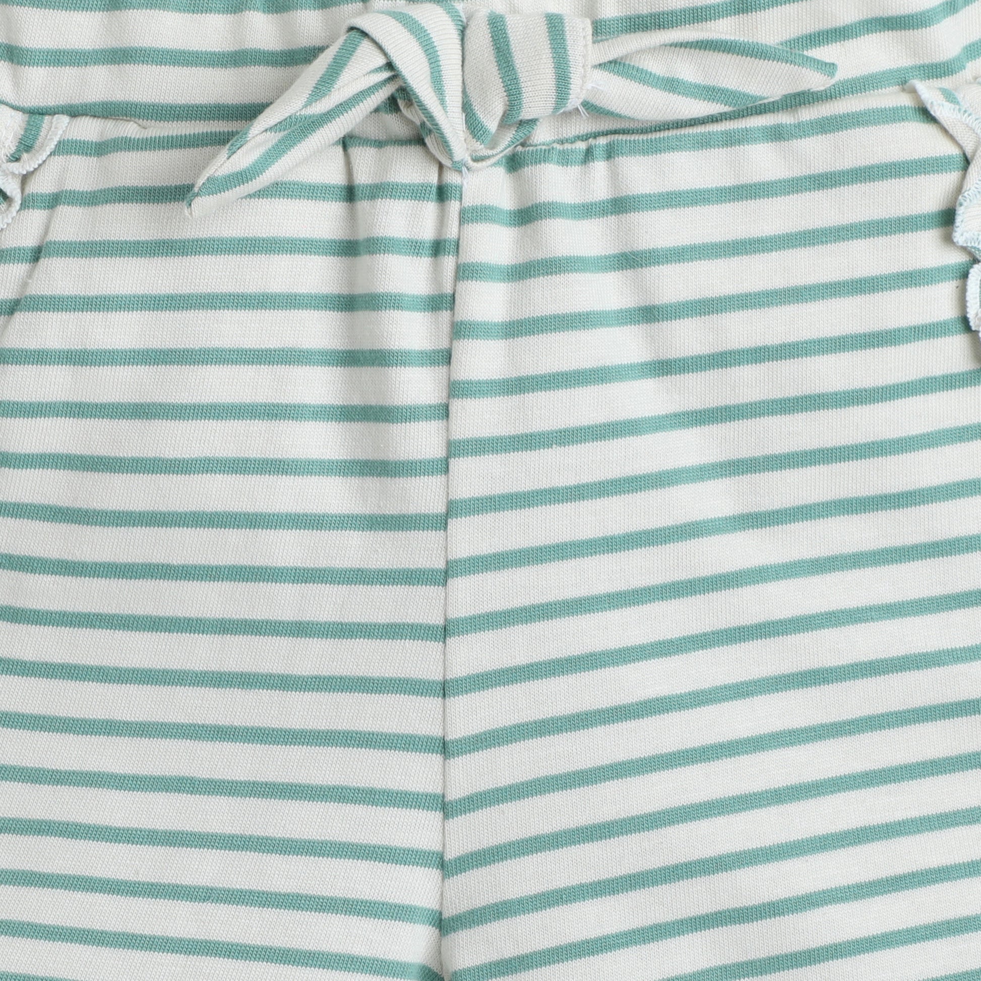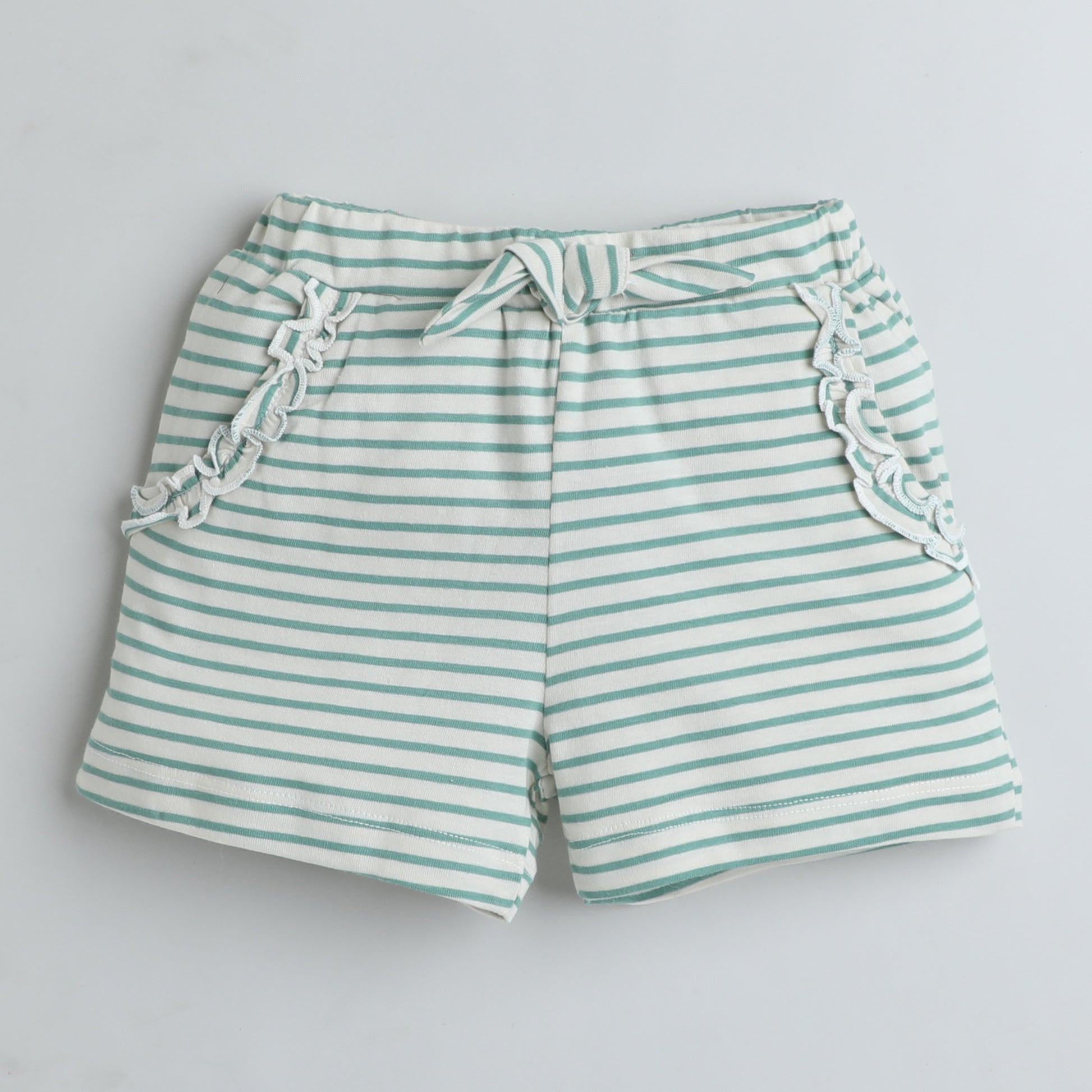 Keep your little one cool and stylish with these girls’ striped cotton shorts. Designed in soothing white and green stripes, these shorts feature an elastic waistband with a cute bow tie for a snug fit. The ruffle-trimmed side pockets add a playful touch, making them perfect for everyday wear, playdates, or outings. Crafted from soft, breathable cotton fabric, these shorts ensure all-day comfort while giving your child a trendy look.